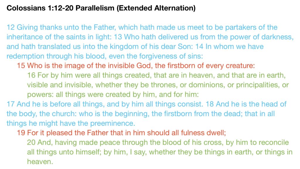It’s not just salvation that all humans will experience, though; it’s also reconciliation. And while the salvation that involves being made immortal is technically only experienced by mortal beings such as humans, reconciliation will be experienced by all sentient beings in the universe who require it, as demonstrated by a passage where Paul used a similar sort of parallelism to the ones he used in 1 Corinthians 15 and Romans 5, this time in the first chapter of his epistle to the Colossians. In fact, I don’t know how someone can read verses 12 through 20 of that chapter and not end up a believer in the reconciliation of all creatures, although it seems most people somehow miss the fact that Paul is using a type of parallelism known as an Extended Alternation here — likely because they probably aren’t familiar with Paul’s consistent use of parallelisms throughout his epistles to prove the salvation (and reconciliation) of all humanity — to tell us that the same “all” created by Him are also the same “all” that are reconciled to Him by the blood of Christ’s cross, and that this passage tells us that not only are all humans (meaning all the things created in earth, as mentioned in both verses 16 and 20) both created by and reconciled to Him, but all the creatures in heaven/outer space (as also mentioned in both of the same two verses, referring to a list of spiritual beings that overlaps with another list of creatures who are described in Ephesians 6:12 as being the spiritual wickedness in high places) are also both created by and reconciled to Him, and there would be no need to reconcile spiritual beings in heaven who weren’t first alienated, so it can only be the foolish (and sometimes sinful, or even evil) spiritual beings in the heavens who are being reconciled; and if all of them are going to be reconciled, as Paul promises they will be in that passage, we know that all the creatures on the earth will be as well, as he also says they will be in the same passage (and these are the group of beings I mentioned earlier that weren’t a part of the first half of the parallelism in 1 Corinthians 15:22, since they aren’t descendants of Adam and hence aren’t mortal like us humans are because of his action, but can still be reconciled to God because of Christ’s action, just like Eve, even if none of them were technically included in the point being made by that particular parallelism).
